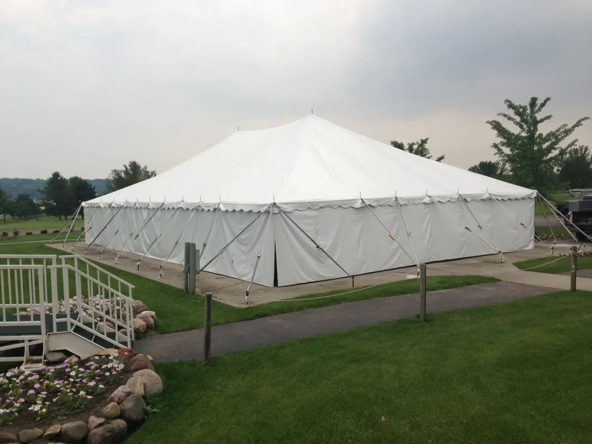 Our 40×60 pole tent is ideal for large events like weddings and corporate gatherings, comfortably accommodating up to 250 guests. With its high peaks and expansive layout, it creates a spacious and elegant atmosphere for any occasion. $1,880